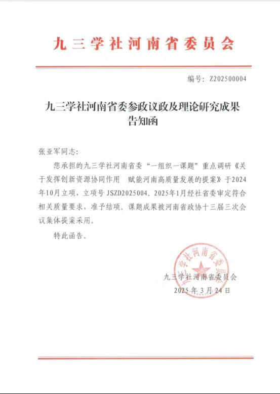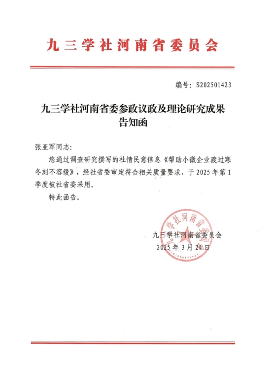 3月24日,九三学社河南省委会来函,我校九三学社社员张亚军副教授承担的九三学社河南省委“一组织一课题”重点调研课题《关于发挥创新资源协同作用赋能河南高质量发展的提案》高质量结项后,课题成果被河南省政协十三届三次会议集体提案采用;其撰写的社情民意信息《帮助小微企业渡过寒冬刻不容缓》,经过九三学社省委会审定并被社省委采用。 (党委统战部 温会敏/文 胡雪艳/审核)